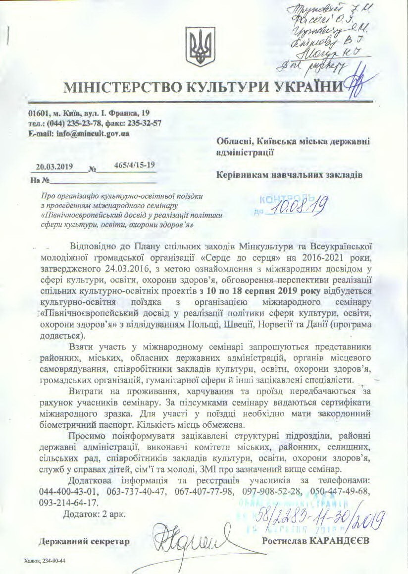 З 10 по 18 серпня 2019 року відбудеться культурно-освітня поїздка з організацією міжнародного семинару “Північно-Європейський досвід у ріалізації політики сфери культури, освіти, охорони здоров’я”