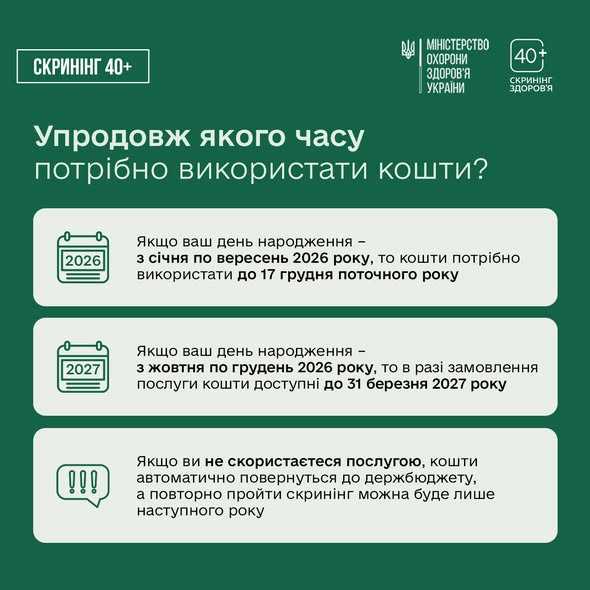 Національна програма Скринінг здоровʼя 40+, спрямована на раннє виявлення серцево-судинних захворювань, цукрового діабету і проблем психічного здоровʼя для українців та українок 40+, запрацювала у перший день 2026 року. І вже наприкінці цього місяця українці та українки віком від 40 років почнуть отримувати перші сповіщення-запрошення пройти скринінг.