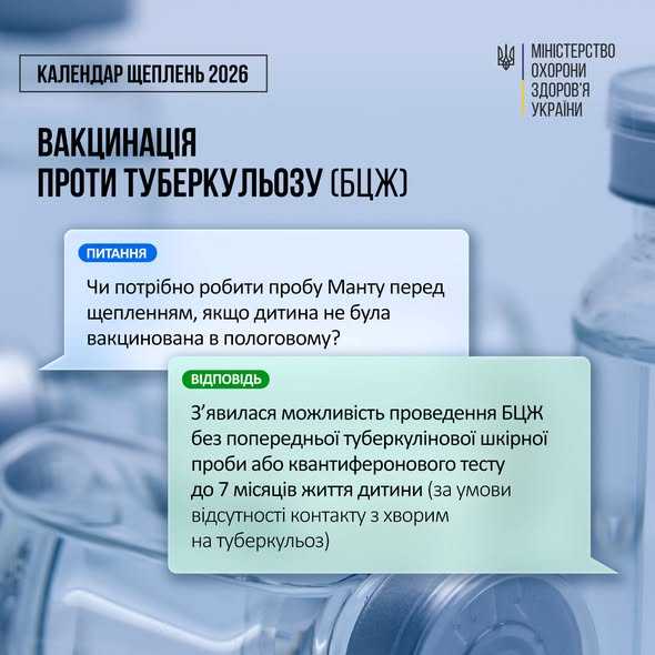 З’явилася можливість проведення БЦЖ без попередньої туберкулінової шкірної проби або квантиферонового тесту до 7 місяців життя дитини (за умови відсутності контакту з хворим на туберкульоз). Раніше цей термін обмежувався 2 місяцями. Це рішення базується на наукових даних: у немовлят до 6 місяців проби часто дають хибнонегативний результат через особливості імунної системи та шкіри. До того ж у перше півріччя життя дитина не має широкого кола спілкування і високого ризику інфікування.